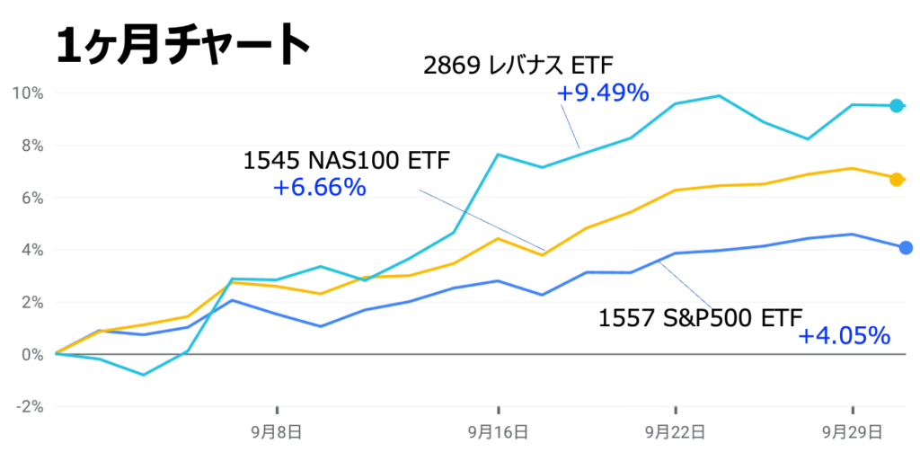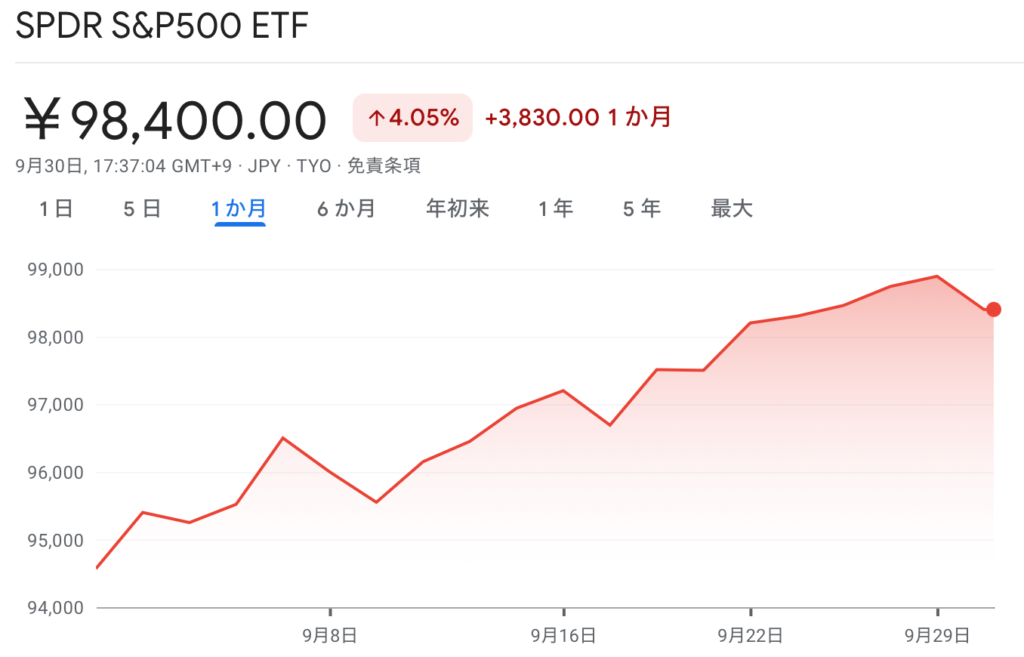 上図はここ1ヶ月のS&P500円建てETFのチャートです。見てわかるとおりの順調な一ヶ月でした。この9月は株式市場にとって最悪の月とも言われ、過去の歴史上はしばしば下落に見舞われたとされます。しかしながら過去は過去。数十年のサンプル期間での偏りは、あまり意味をもたないというのが私のスタンスでした。たまたまではありますが、今年はそのとおりと言わんばかりの好調です。