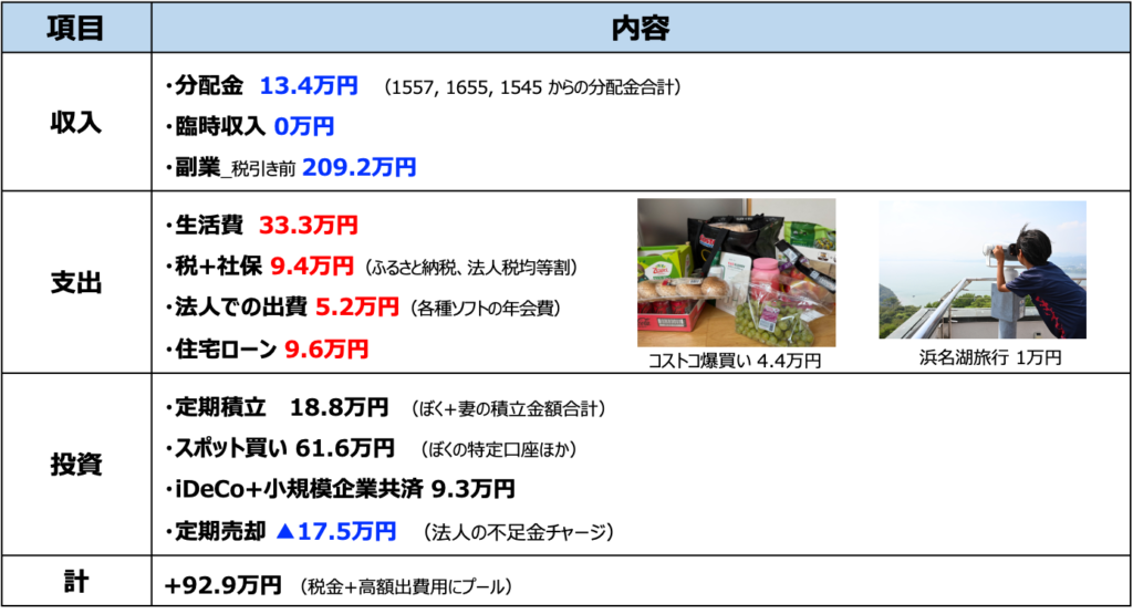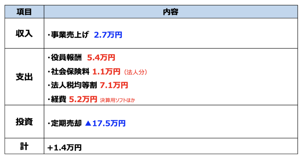 上図は法人の資金収支です。前述のとおり、法人での支出は投信の売却でまかなうようにしました。また、決算を終えて3期目に入ったのを契機に、役員報酬を4.5万円→5.4万円に増額しています。これは今年から給与所得控除が増額されたので、それを反映したものです。経費に積めるものは積んでおきたいですからね。