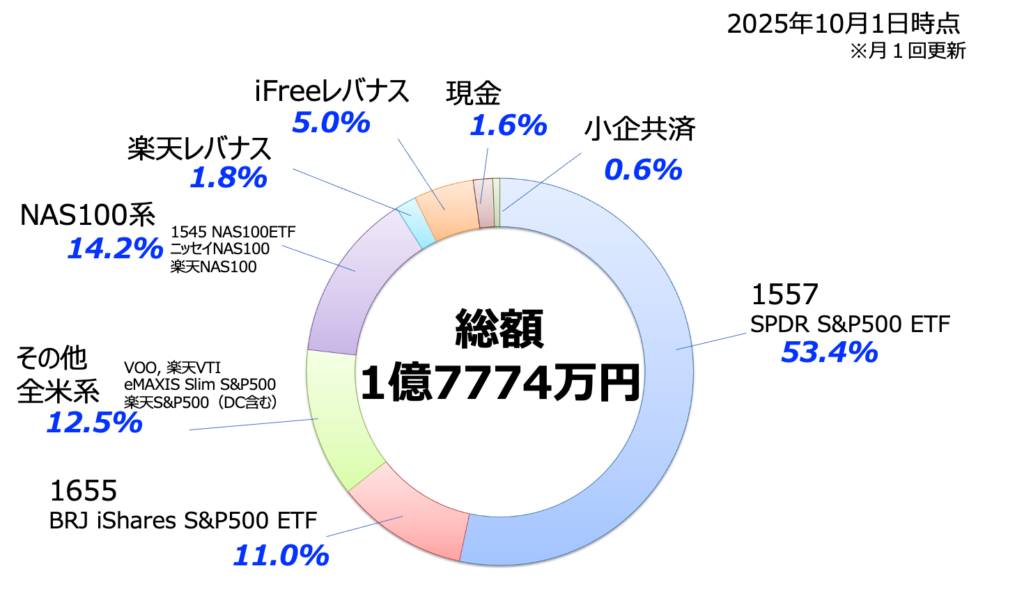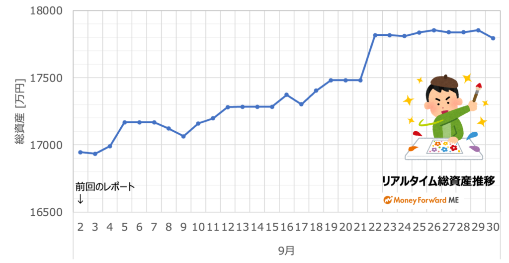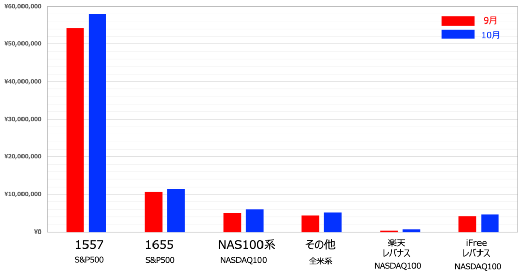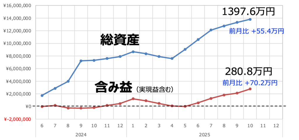 上図は先月のリアルタイム推移です。順調に右肩上がりで推移したのがわかりますね。不調の9月を前に売ってしまいましたというコメントも数多くいただきましたが、私自身はその手の揺さぶりに屈さずによかったと思っています。当然減る世界線もありえたわけですから増えたのも偶然ですし、結局は自己責任なんですけどね。