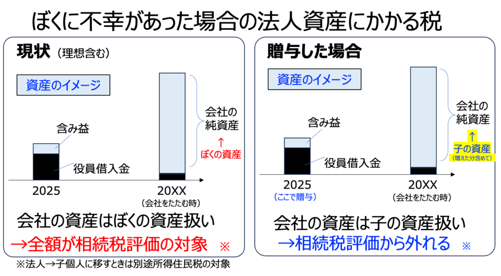 さらには法人の持分を早期に子どもに贈与することを検討しています。これは贈与税の非課税枠(110万円以内/年)に収まるように持分を子どもに移転する、というものです。こうすることで、相続するときに私の持分はほぼなくなって、会社の資産は相続税算出の対象から外すことができます。具体的にはこれから法人で積み重ねられる(予定)の含み益は子どもの持分になるということです。法人の資産は私の中でも10%以下なのですが、まずは相続税対策として後悔する前に動いておくことにしよう、という狙い。