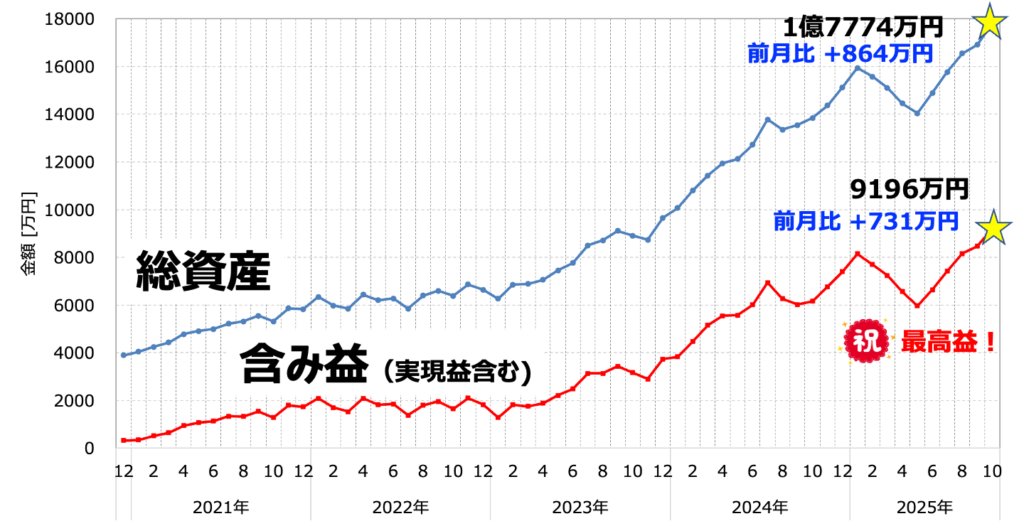上図は最新の資産推移をまとめたものです。総資産は最高額の1億7774万円、含み益も最高益を更新して9196万円に到達しました。前月からは総資産+864万円、含み益は+731万円となっています。いよいよ儲けが1億円というレベルが見えてきました。すこぶる順調すぎて、本当に現実なのかこわくなってきますね。