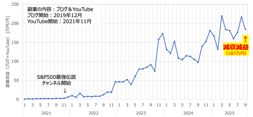 上図は先月の副業収益です。サラリーマンをやめてしまった今はもう本業なのですが、その収益は前月比でけっこう下がってしまいました。注目を集める動画を作ることができず、数字が伸びませんでしたね。頭が冴えてる時間も少なくて、企画段階からピンときていませんでした。ここでオワコンにならないよう、コンディション整えてチャンネル伸ばしていきたいですね。