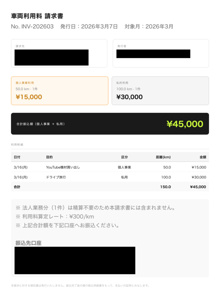 上記の機能が実現できれば、クルマを運転して疲れて返ってきたときにオドメーターを見ながらちょちょいと記入するだけで使用記録が完結します。そして月末に請求書を発行して振込、個人事業と法人で記帳するだけ。ずいぶんラクに自動車の使用記録を管理できるでしょう。