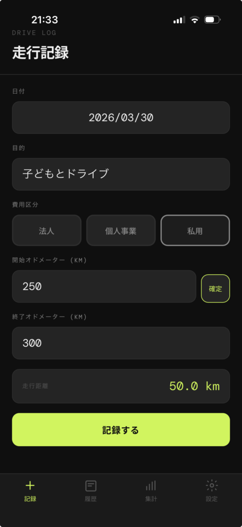上記の画面がアプリを開いたときに開く「記録」メニューです。運転が終わったときに、目的や費用区分、終了オドメーターを記録します。開始オドメーターは前回記録の終了オドメーターから自動参照。日付もその日の日付がデフォルトで入力されているので、記入するのは目的、費用区分、終了オドメーターのみ。