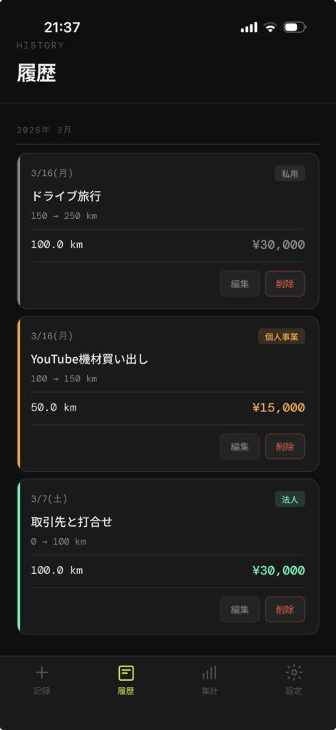 「履歴」のメニューでは運転した記録を見返すことができます。各記録の走行距離などを使って費用は自動計算する仕様です。間違っている部分があれば、編集することもできます。