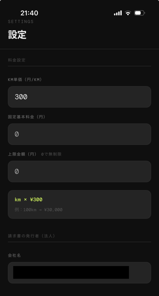 料金の計算は設定画面から行います。計算は km単価や固定基本料金、上限の金額などを設けて任意の料金体系で計算可能です。この計算については、何らかの筋が通る値にしておくのが重要でしょう。特に安すぎると、役員に不当に安い値段で貸し出したとして疑われることになります。
