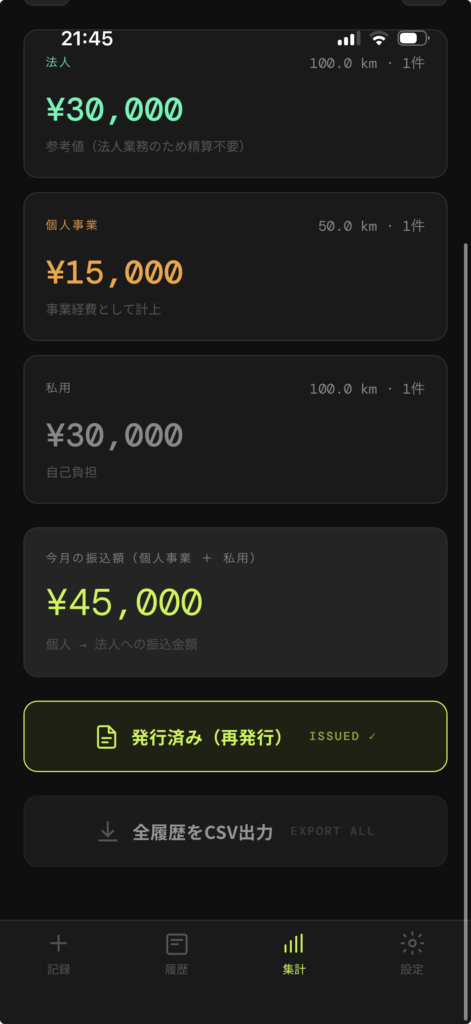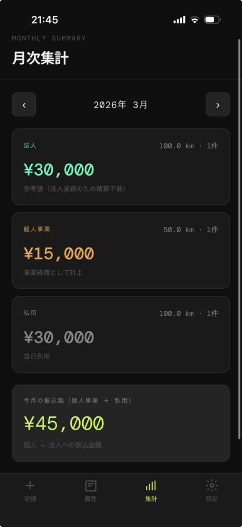 「集計」メニューでは月ごとに使用したデータに基づいて金額が計算されます。実際に精算が必要なのは「個人事業 + 私的利用」の部分なので、その合計も確認できるようにしました。