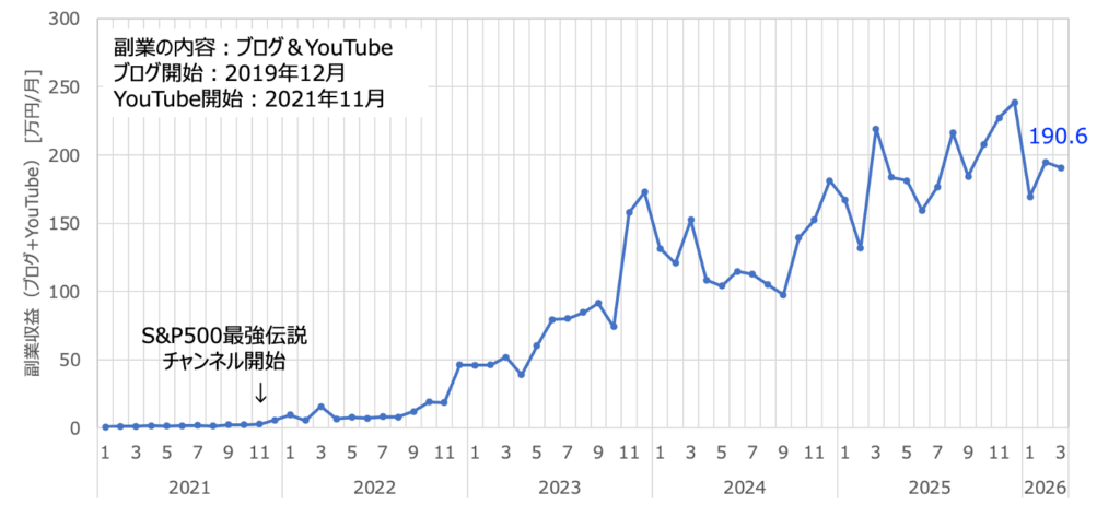 上図は最新の副業収益推移です。3月は本来YouTuberにとっては稼ぎ時であります。ただ、うまく視聴者のニーズを捉えることができず、再生数は伸び悩みました。収入金額そのものは悪くはないですが、これは稼ぎ時ブーストによるところが大きいでしょう。このままだと4月も減ってしまいそうなので、少し動画にもテコ入れをしていこうと思っています。