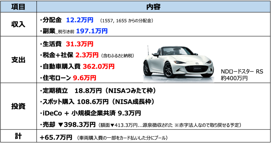 上表は先月の家計収支のまとめです。何度も登場してる「自動車購入」のおかげで見えにくくなっていますが、生活費はそこまで大きくなくてGoodだと思ってます。一方で退職後の目標収入10万円/月に対して副業収入は非常に好調です。動画投稿の負荷は年初からとてもラクになったのですが、そこまで収入は減っていません。見ていただけるみなさんのおかげですほんと。
