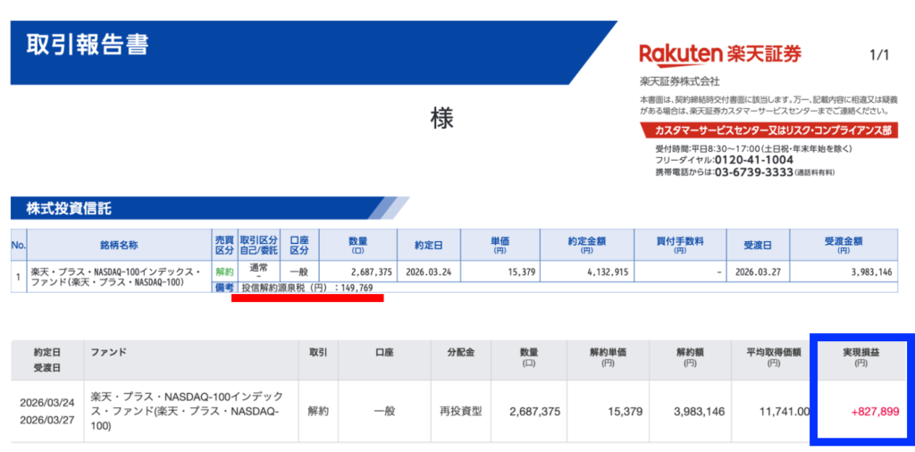 上図は法人で売却したときの明細表です。あまり世間でも情報がないかもしれません。法人口座での投信売却には解約と買取があり、楽天証券では解約でしか売却できません。この場合、利益の約15%を源泉徴収されます。それが明細にも記載されてますね。