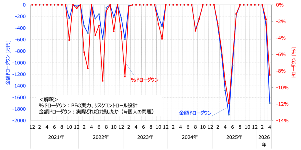 上図は総資産の金額ベースと%のドローダウンを並べたもの。入金を継続していくと、ドローダウンの金額ベースは大きくなっていきます。これがまた悲観を生みやすいですが、運用で重要なのは%ベースのドローダウンです。金額は個人次第で意味が異なってきますが、%ベースは運用の実力を表していますから。まあ私の資産のドローダウンは大きいのですが2%は車です(笑)そう考えると、そんなに大きな下落ではないのがわかりますね。