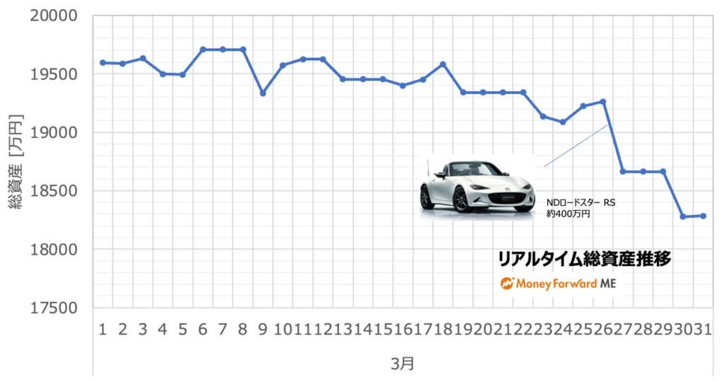 上図は日毎の総資産推移を示したものです。3月はいいところがほとんどなく、緩やかに資産が減少していきました。終盤で大きく下がっているところは前述の自動車支払いをした日です。
