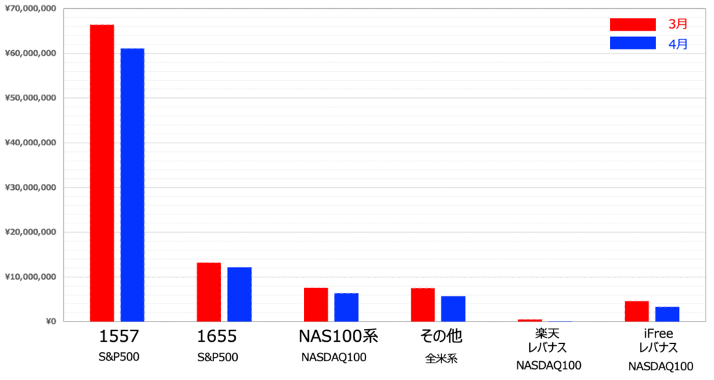 上図は各銘柄の損益変化を示しています。全体的に下がってるのでどれで見ても下がってますが、NASDAQ系がより一段と大きく下がってるのがよくわかりますね。