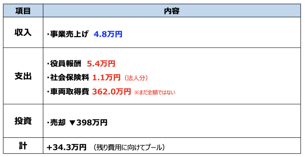 上図は法人の資金収支です。出費が大きすぎてよくわかりませんが、事業の売上はそんなに悪くありません。最近はせっかく作ったこの法人で、何か事業拡大できないか?を模索しています。いいアイデアはなかなか出てきませんが。