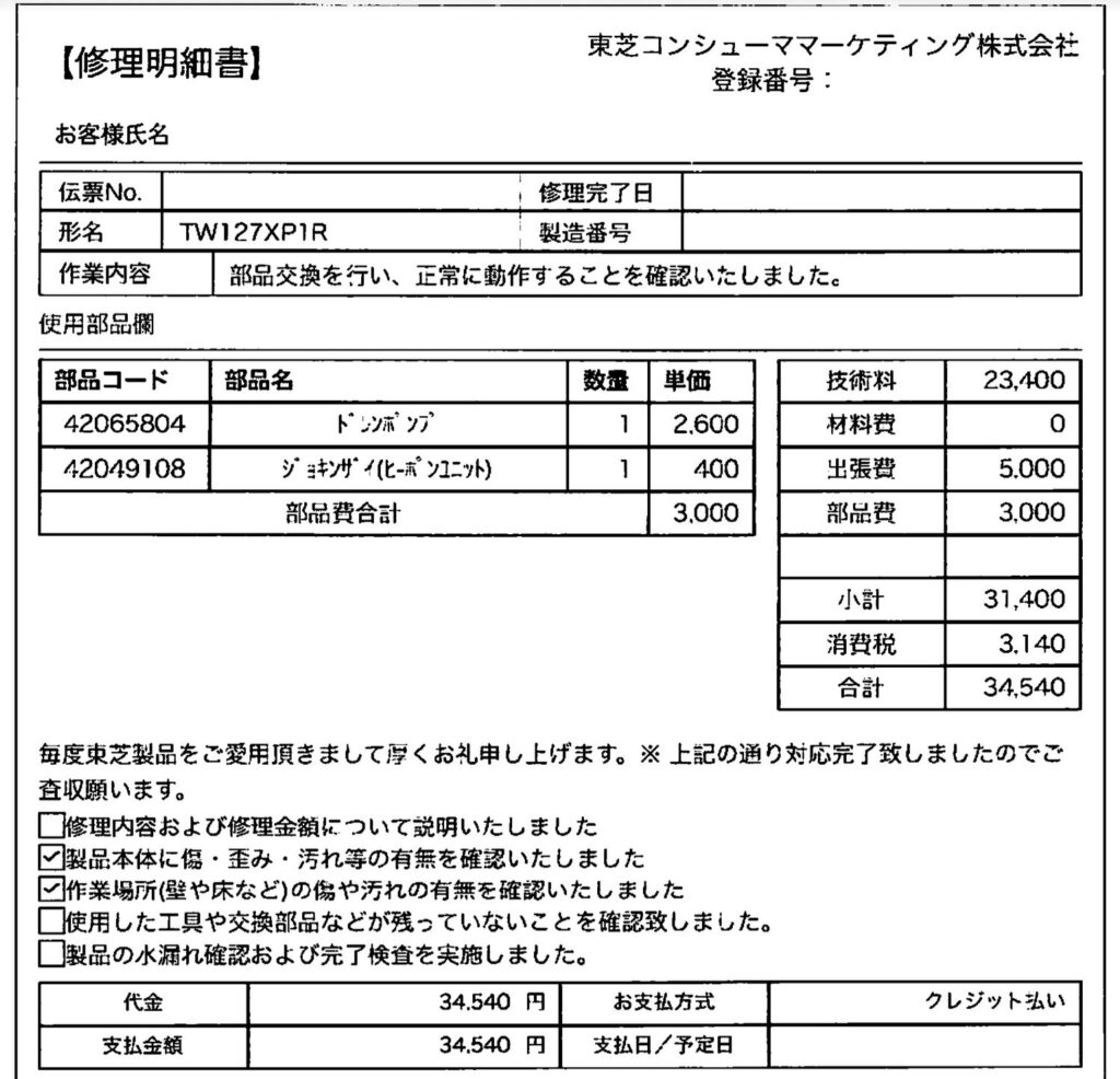まさかの3万円オーバーです(泣)ほんと家電保険続けてればよかったよ…。内訳を見るとほとんどが人件費。まあそうなるよね。最近はインフレもしてますから。