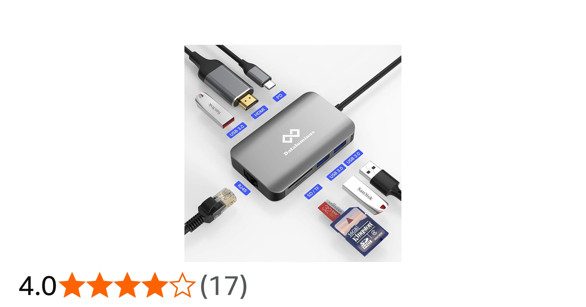 激安のUSB-Cハブです。USB3.0ポートが4つ、HDMI、有線LAN、SDカード、Micro-SDカードリーダーがついてます。